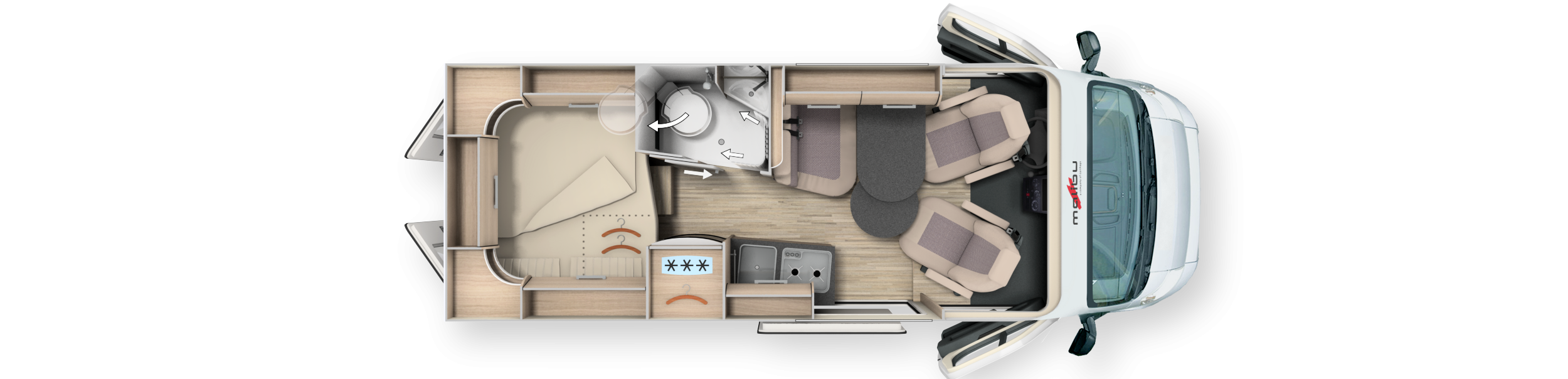 - Einzigartiges Zwei-Raum-Konzept mit echter Trennung von Wohn- und Schlafbereich für mehr Privatsphäre und ein Raumgefühl wie im Reisemobil